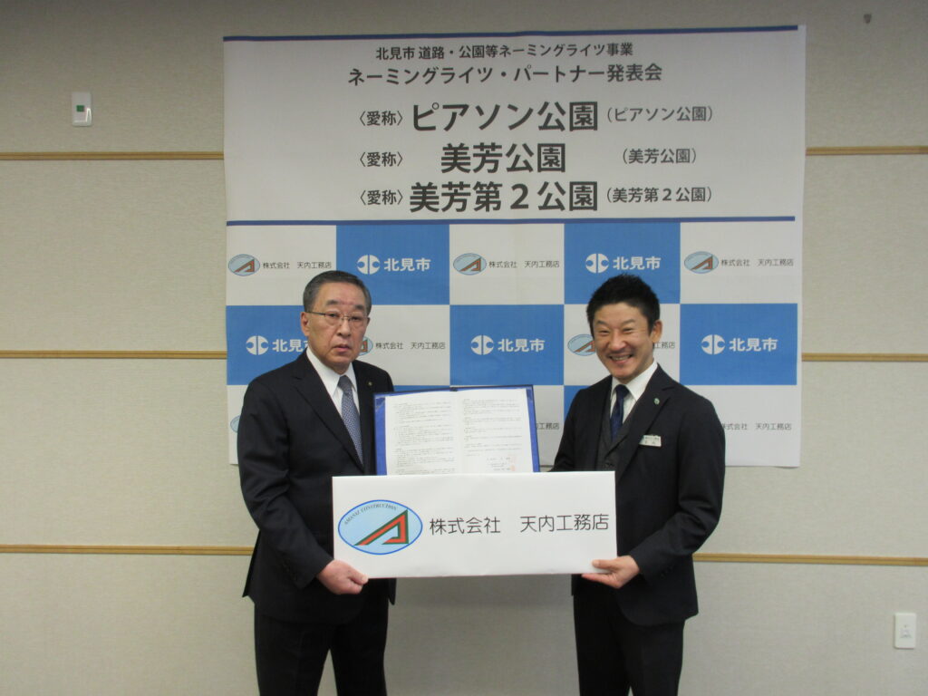 株式会社天内工務店は、このたび北見市が実施する「道路・公園等ネーミングライツ事業」において、ネーミングライツ・パートナーとして契約を締結いたしました。